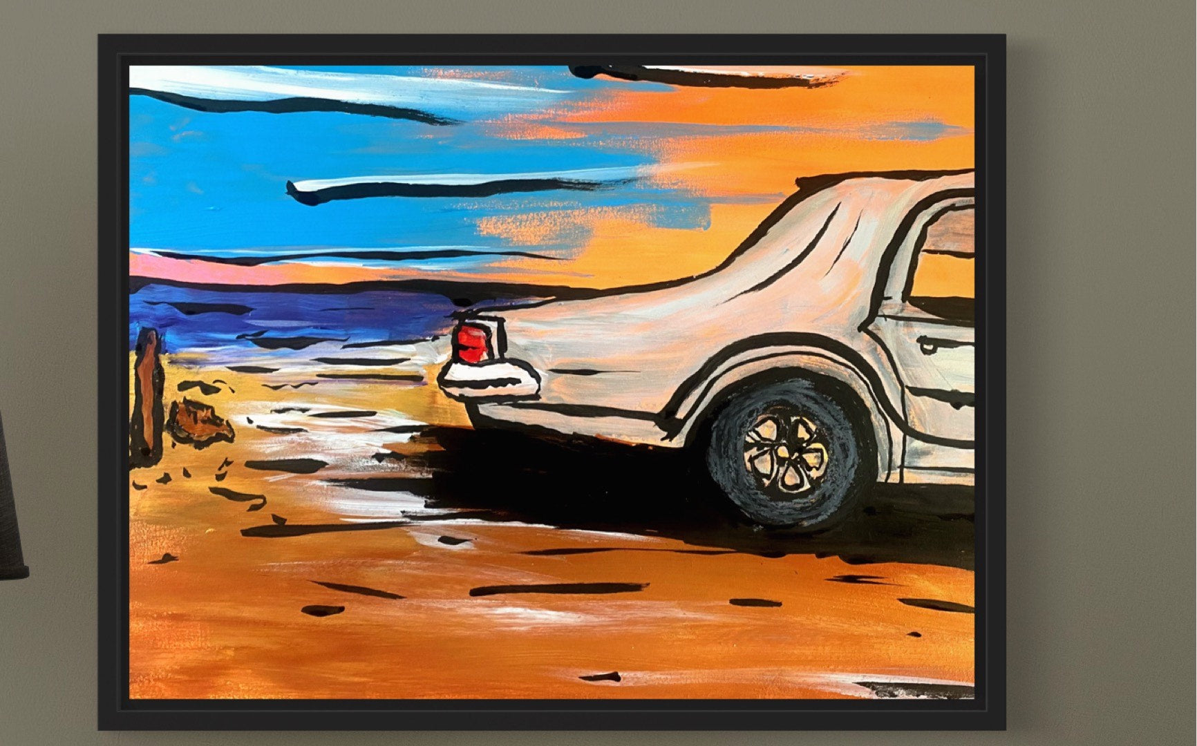Partly fluorescent sky, silver car with pink tinge, paired with Indian ink, the work will change personality based on lighting and time of day.