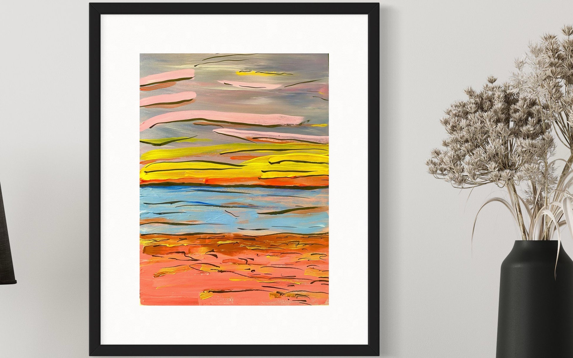 Rose gold sand with silver-based sky, paired with Indian ink, the work will change personality based on lighting and time of day.