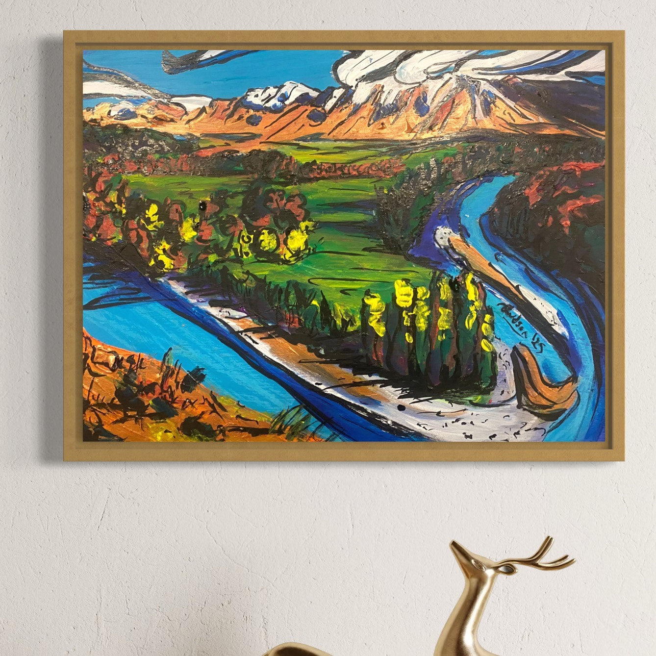Metallic gold mountains with silver on the riverbank, paired with Indian ink, the work will change personality based on lighting and time of day.